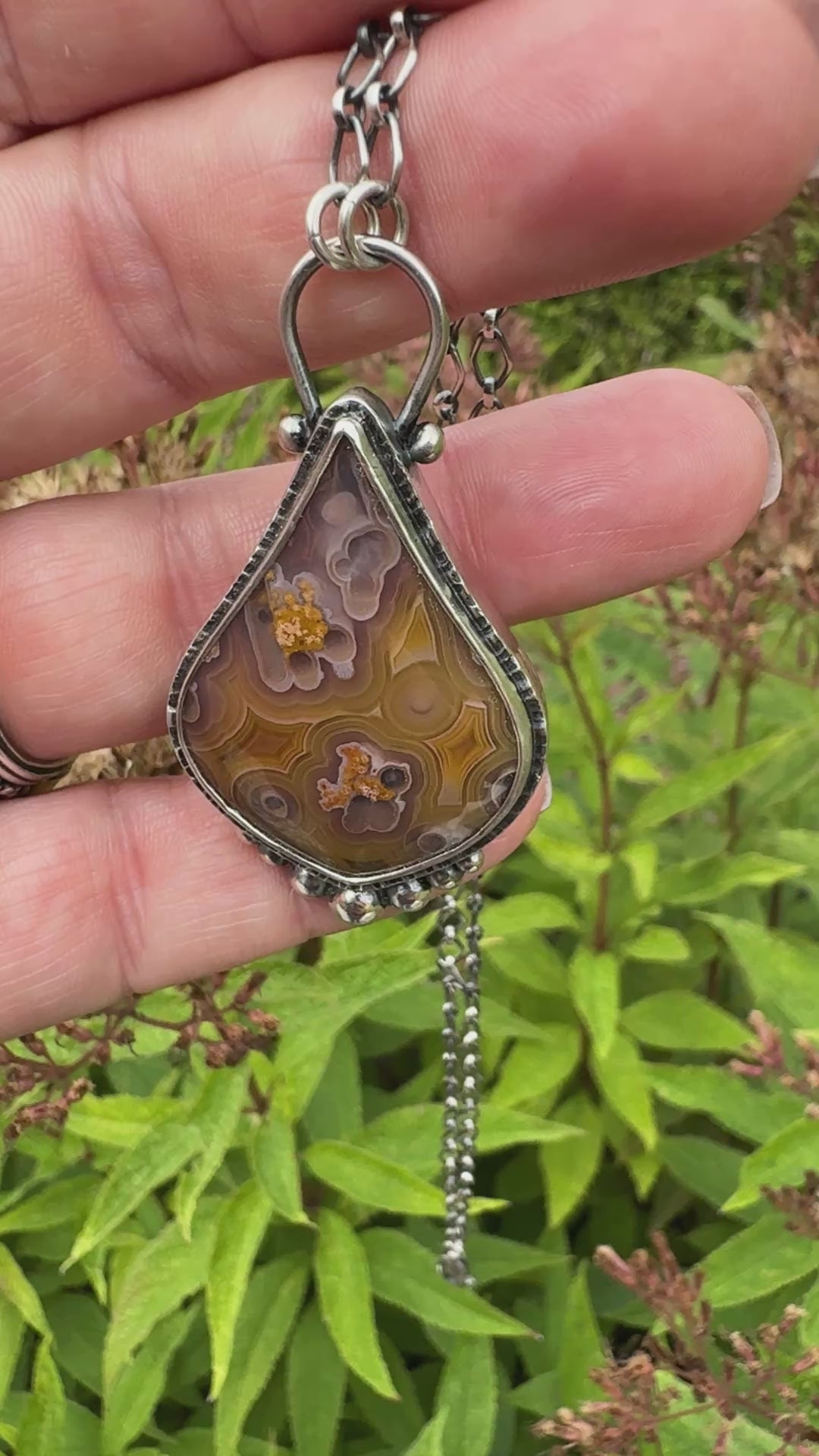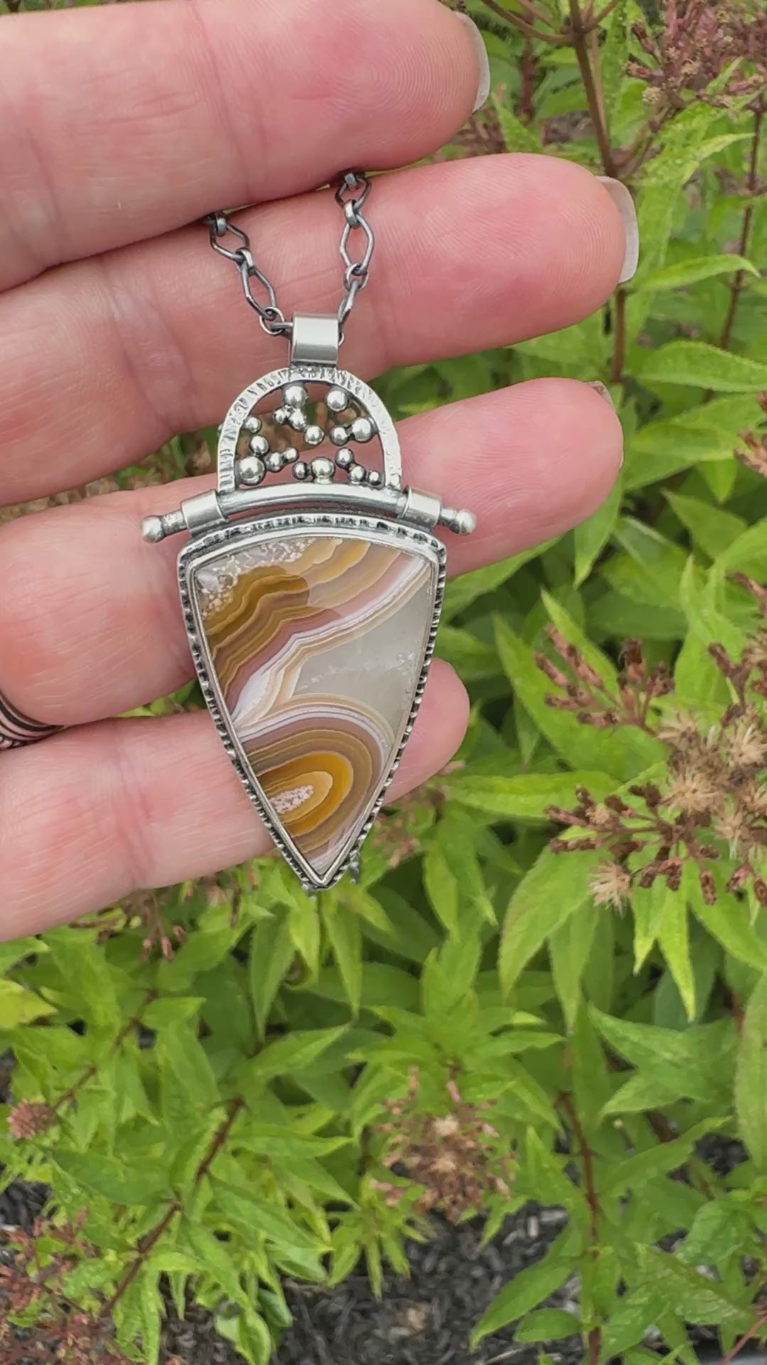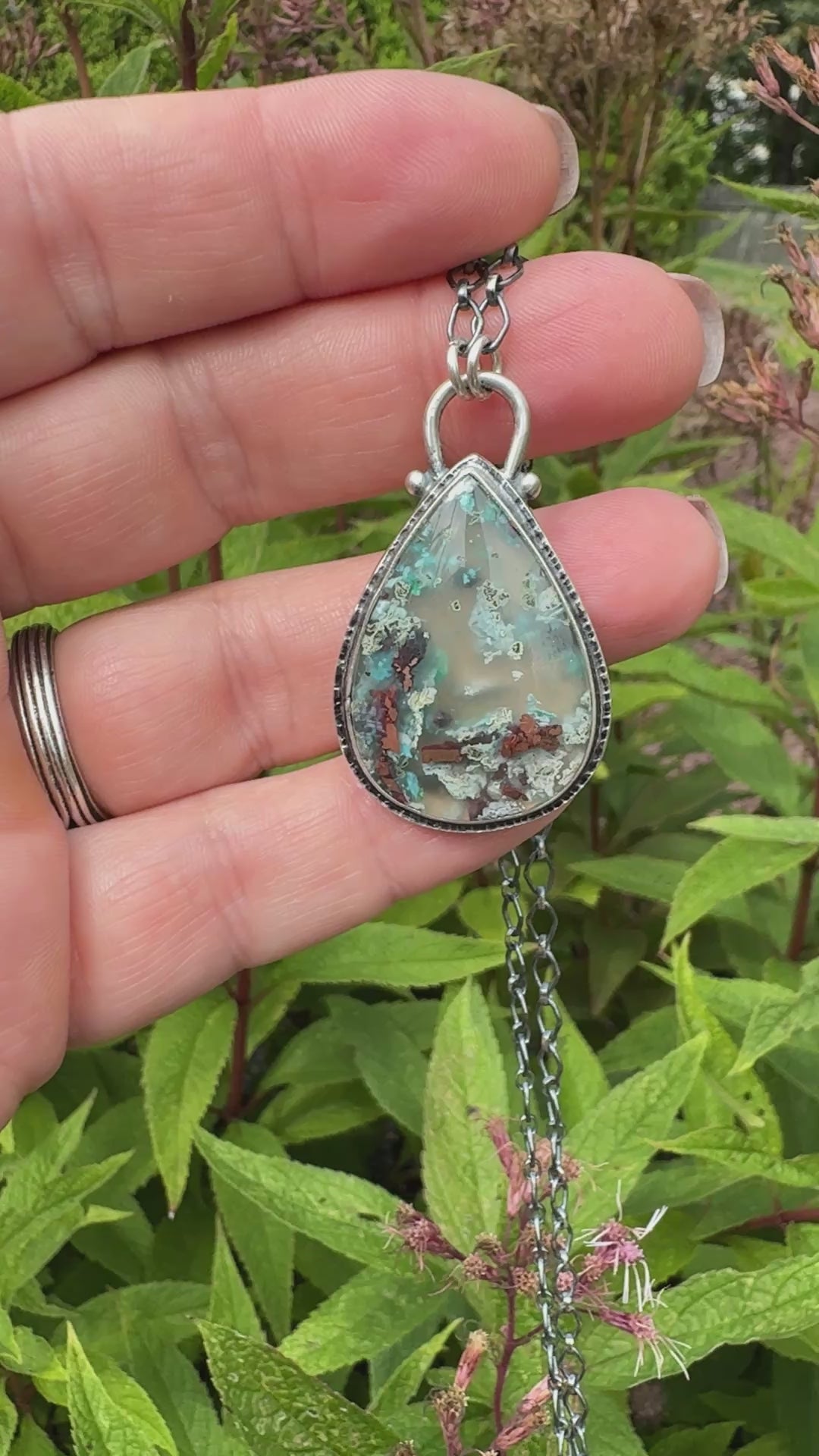 African Fire Sunstone Pendant Necklace Sterling Silver This necklace is so beautiful. In the light you can see a horizontal rainbow of colors. This will go with anything I'm wearing! It's so well made and arrived quickly. I give it 5 stars!