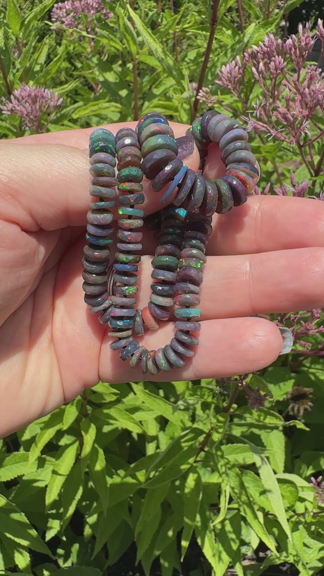 This strand features faceted Black Ethiopian opals, some of the most mesmerizing stones you’ll ever see. At first glance, they appear dark and mysterious, but when the light catches them, flashes of vivid green, red, and blue ignite across their surface. Their fiery play of color feels almost otherworldly, like holding a galaxy in your hands. A piece like this is a true splurge, but absolutely worth it for its rarity and beauty.