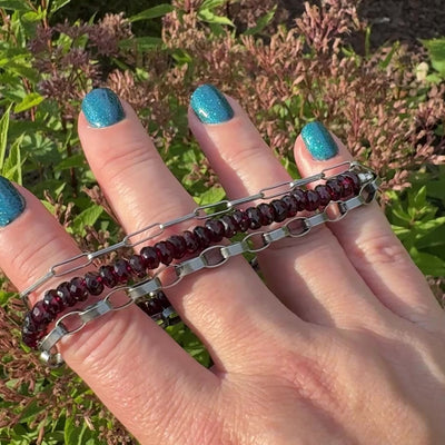 This triple strand bracelet layers two distinctive sterling silver chains with a strand of faceted garnet beads, creating depth and dimension that feels both grounded and elegant. The garnets are a very deep, dark red, rich with sparkle that catches the light with every movement and enhances the bracelet’s bold character. It’s versatile enough for everyday wear, yet bold enough to stand on its own as a statement.