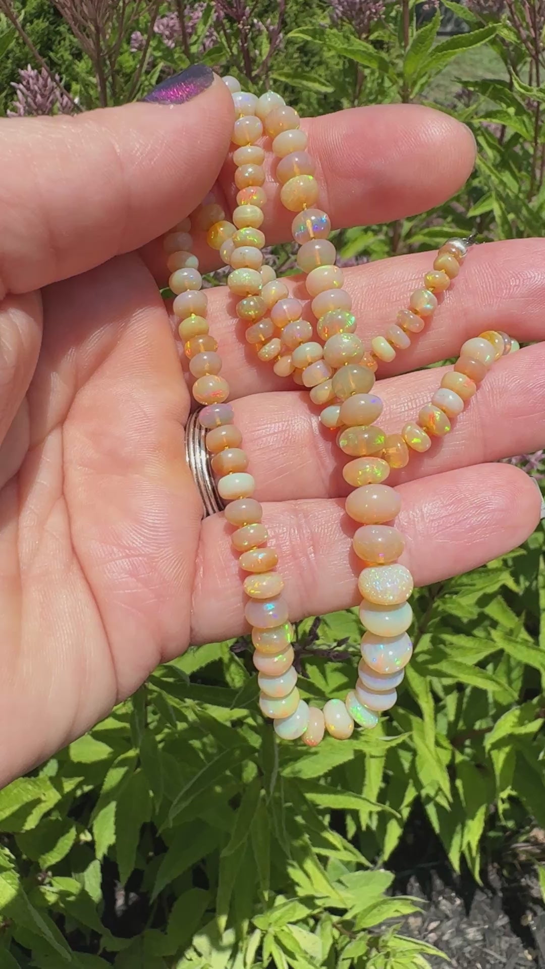This strand of Ethiopian opal is nothing short of mesmerizing. The stones flash with shifting fire, greens, oranges, violets, and blues, like sparks caught inside translucent water. They glow with an inner light that feels alive, a constant play of color and movement that keeps the eye lingering. High-grade and rare, this opal is a bit of a splurge, but the kind of treasure you’ll never regret owning.