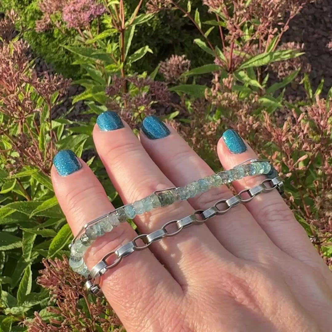 This three-strand bracelet layers two distinct sterling silver chains with a strand of shimmering moss aquamarine beads. The faceted roundels shift between soft greens and stormy blues, echoing the colors of the sea and sky. Their subtle sparkle pairs beautifully with the textured silver, giving the piece both depth and versatility. It’s versatile enough for everyday wear, yet bold enough to stand on its own as a statement.