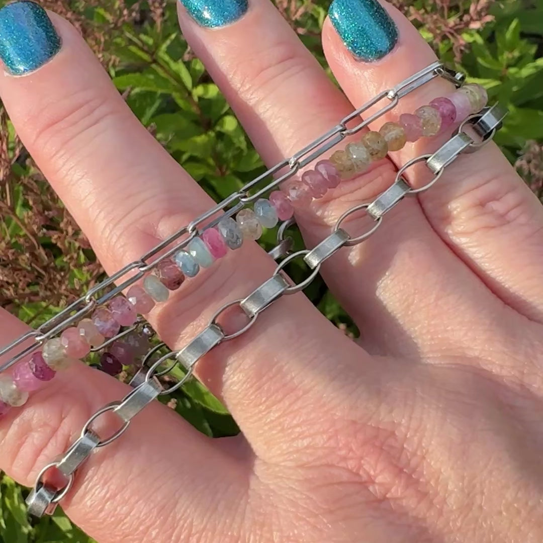 This bracelet layers the richness of texture and color into a single piece. Three strands come together—two in sterling silver chain and one in sparkling sapphire beads—creating the effect of stacking without the fuss. The sapphires shimmer in a rainbow of hues, each faceted bead catching the light with subtle fire. It’s versatile enough for everyday wear, yet bold enough to stand on its own as a statement.