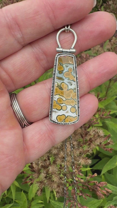This pendant features a striking slice of orbicular jasper, patterned with golden yellow orbs floating in a soft white matrix, punctuated by subtle druzy pockets that sparkle in the light. I've set it in my signature double bezel and added a hinged bail at the top for a little swing and movement. This is on a long chain because I was liking the look of this on a longer chain, I can always adjust this length if you want though. I don't have many of this stone left with this gorgeous and vibrant pattern, as with all the stones I like to use once they are gone they are gone so if you've been holding off on this one you may want to grab one with this pattern while you can, I'm nearing the end of my stash!
