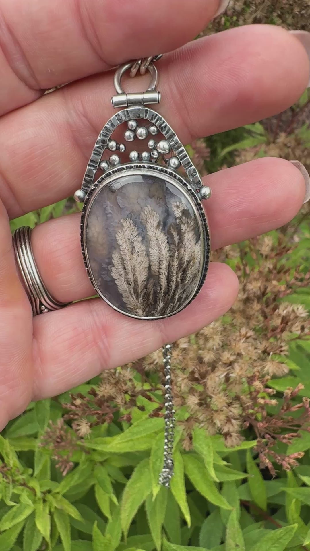 This pendant features a striking plume agate, where delicate, feathery inclusions rise through the stone like wisps of smoke or billowing ferns. The plumes appear suspended in motion, giving the piece an otherworldly depth and presence. Its natural beauty is framed in sterling silver with a crown of granulation above, adding balance and intrigue to the design. This is a rare and enchanting stone, unlike anything you’re likely to see again, an heirloom piece with timeless allure.