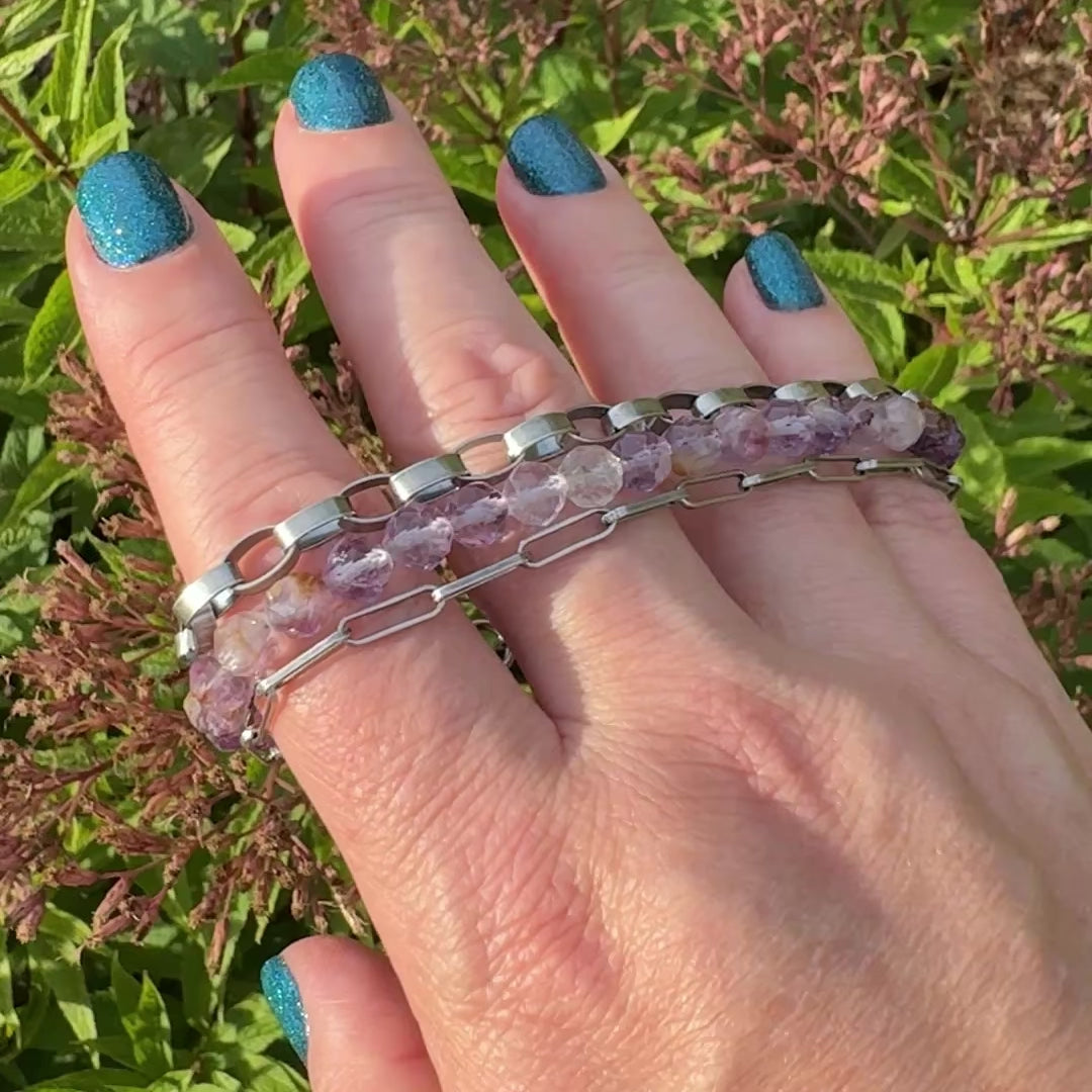 This triple strand bracelet combines two unique sterling silver chains with a strand of faceted super seven beads, creating a piece that feels layered and full of dimension. The gemstones shimmer with hues of mainly amethyst, flecks of rutile, and some earthy browns, each bead holding its own subtle variation. Because these bracelets are made to order, the multi-colored beads will be strung in a random sequence, ensuring every piece is truly one of a kind. It’s versatile enough for everyday wear, yet bold enough to stand on its own as a statement.